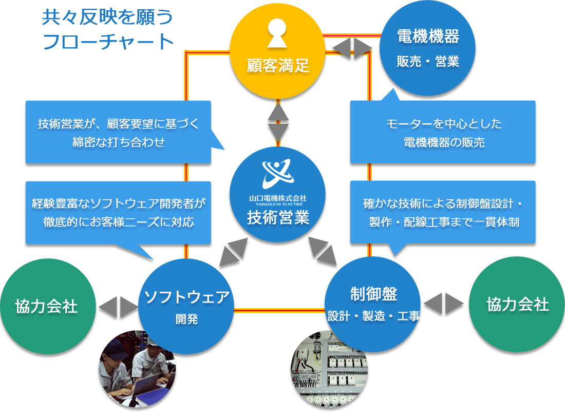 当社は、モーターを中心とする電気機器の販売と、 各種産業機械の制御盤の設計・製作から現地調整までを、一貫体制にて取り組んでいます。 小規模会社の特徴を存分に活かし、価格・納期・品質等、 お客様の多様な ニーズに合わせ、小回りの利くフットワークを第一に、 社会に貢献したいと考えております。